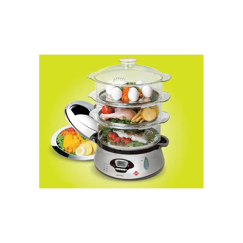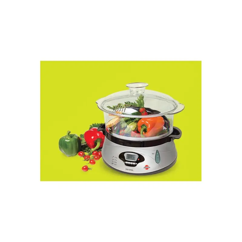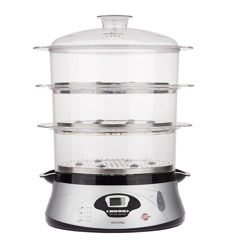 بخارپز پارس خزر مدل دیجی استیل دستگاهی مناسب برای افرادی است که می خواهند غذای سالم و بدون روغن بخورند. این دستگاه برای تهیه مخلفات کنار غذاهای گوناگون هم کاربرد دارد. تهیه هویج پخته، سبزیجات مختلف، سیب زمینی پخته و … با این محصول بسیار آسان است. توان بالای دستگاه آب را سریع به بخار تبدیل کرده و بخار داغ از میان طبقات و مواد غذایی مختلف عبور کرده و باعث پخت آنها می شود. وزن دستگاه کم است و ظرفیت بالایی دارد، همچنین در حین فعالیت و در میانه پخت هم می توان مقدار آب باقی مانده در دستگاه را از طریق نشانگر میزان آب کنترل کرد  و در صورت نیاز به دستگاه آب اضافه کرد. پنل تنظیم دستگاه شامل دکمه ها و نمایشگر در جلوی آن قرار دارد تا از طریق آن تنظیم مربوط به مواد غذایی انتخاب و تعیین شود. طبقات را می توان روی هم قرار داد و از طرفیت کامل دستگاه بهره برد و در صورتی که مواد غذایی کم هستند می توان طبقات اضافی را از روی دستگاه برداشت .