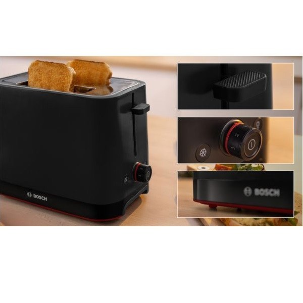 بر روی بدنه توستر BOSCH TAT3M123 چند دکمه به چشم می خورد و شامل دکمه چرخشی تنظیم میزان برشته شدن نان، دکمه یخ زدایی و توقف عملیات می باشد که علاوه بر زیبایی، کاربری دستگاه را نیز راحت تر کرده است. بالای بدنه دو عدد شکاف به چشم می خورد که می توان درون آن دو نان تست، دو عدد شیرینی و یا تکه های نان بربری و سنگک را قرار دهید. توسط دکمه کشویی روی بدنه می توان در انتهای عملیات گرم شدن، نان ها را برای برداشتن به سمت بالا بکشید.
