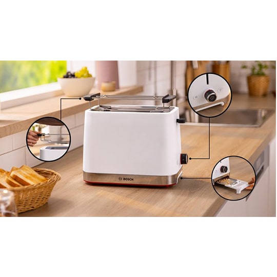توستر بوش TAT4M221 دارای سینی جمع‌آوری خرده‌نان است که به آسانی جدا می‌شود و نظافت آن را آسان می‌کند. این ویژگی می‌تواند به حفظ تمیزی آشپزخانه کمک کند و خرده‌نان‌های ایجاد شده را به راحتی جمع‌آوری کند.
