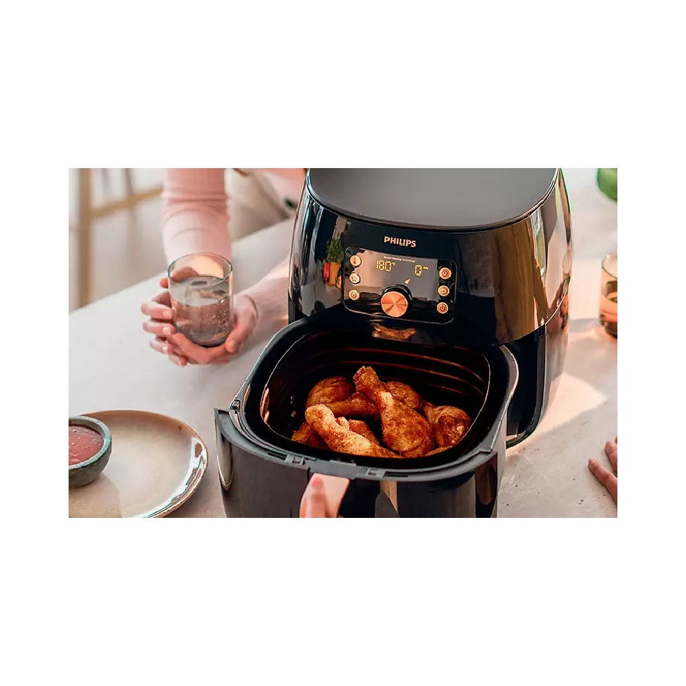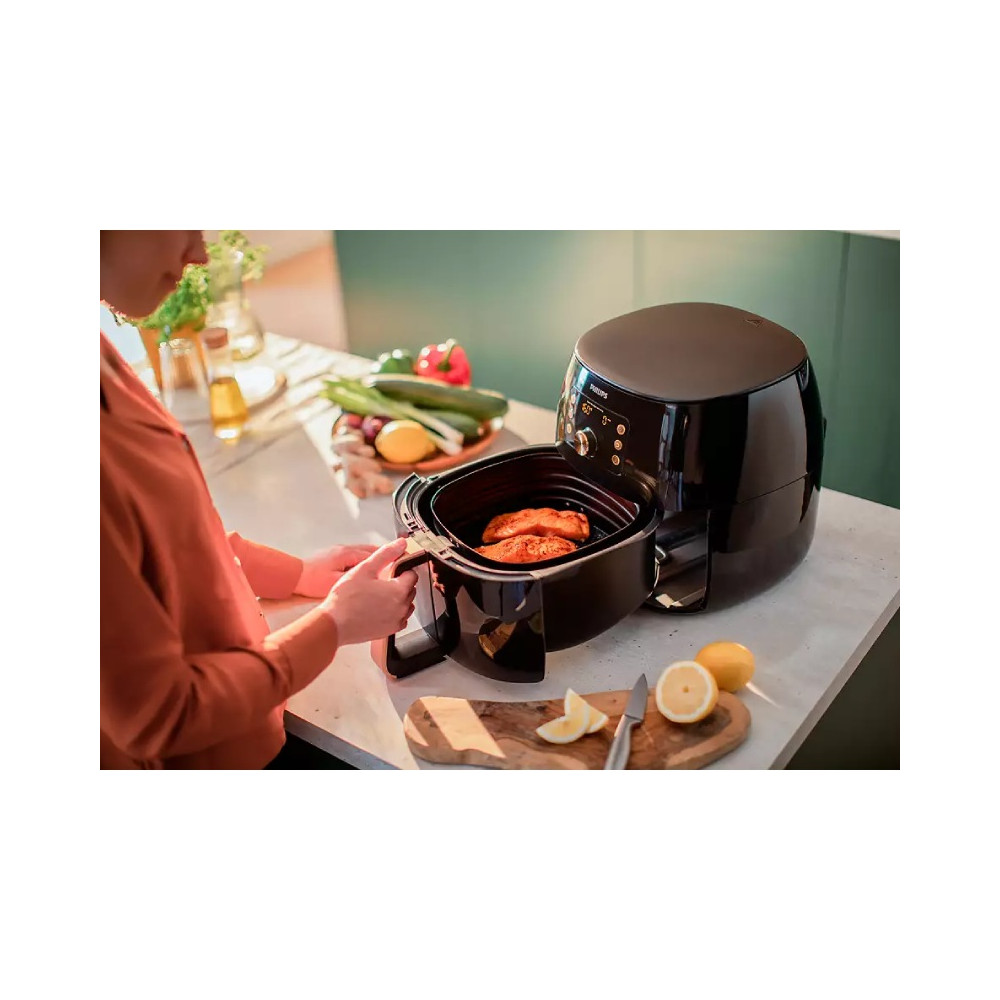سرخ کن فیلیپس 9867 با ظرفیت XXL که حجم نسبتا خوبی است، یک مرغ کامل یا کباب 1.4 کیلوگرمی را بپزید. به لطف ظرفیت کامل آن، می توانید غذاهای بزرگ و خوشمزه را راحت تر طبخ نمایید. با سبد بزرگ 7.3 لیتری می توانید تا شش وعده غذای خوشمزه را بدون زحمت و دردسر تهیه کنید. اعضای خانواده یا دوستان خود را با یک مرغ شکم پر ترد و لطیف خوشحال کنید.
