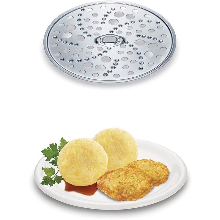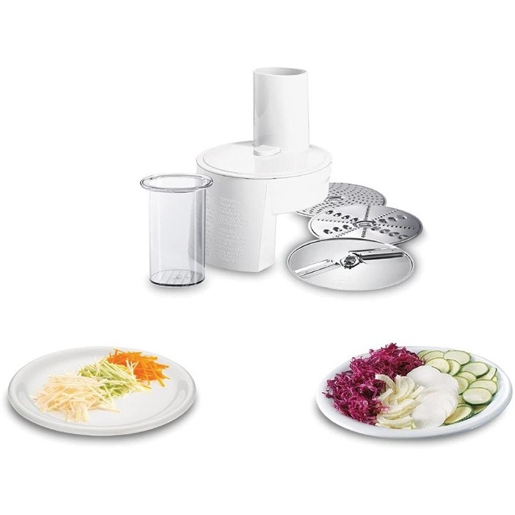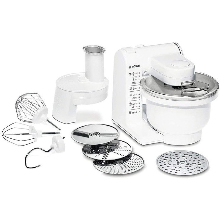 4 دیسک از جنس استیل ضد زنگ برای رنده نمودن ریز و درشت ، ورقه نمودن و پوره نمودن مواد غذایی به کار میرود.  توسط پنل دستگاه میتوان سرعت را در 4 درجه تنظیم نمود . بازوی دستگاه به راحتی و با فشردن یک کلید بالا میرود و سری ها را میتوان تعویض نمود. ماشین آشپزخانه بوش مجهز به سیستم ایمنی بوده و در صورت گرم شدن بیش از حد موتور به صورت خودکار خاموش میشود.