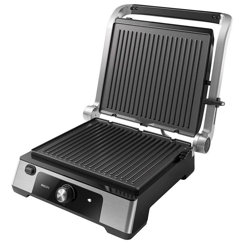 صفحه بالایی این گریل بسته به غذایی که درست می کنید در 5 زاویه قابل باز شدن است و تا زاویه 180 درجه نیز به طور کامل باز می شود. برای تنظیم ارتفاع در کنار بدنه دکمه ای طراحی شده که می توانید برای غذاهای ضخیم تر، پیتزا و ساندویچ های روباز به راحتی ارتفاع صفحه گریل بالایی را بیشتر کنید. جهت جا به جایی و عدم آسیب صفحات دستگیره را ببندید و قفل نمایید تا با خیال راحت گریل خود را با حمل و نگهداری کنید.